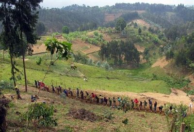 FARMING IN RWANDA: Villagers team up to hoe a field in the Gishwati area. Rwandan agriculture generally doesn't use modern equipment.Photo: Perry Beeman