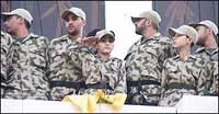 | The fighters in the Hezbollah military parade, like these men, march without weapons. The party says that carrying weapons for parades has caused friction in the past, so leaders decided to set them aside. |
