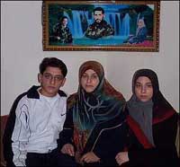 | The family of Zaki Haidar, a soldier who died 15 years ago while fighting Israel, pose beneath his picture. They say Hezbollah stepped in after their loss to offer help, including covering the private education of both children. Zaki Haidar, who was 40 when he died, is known in Lebanon as a martyr for his sacrifice. In the image with him are his two children. |