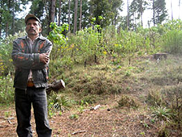 Vincente Guzman Reyes stands in a portion of the butterfly preserve that was illegally cut by loggers. In response to the logging, his community organized volunteer patrols that keep watch over the forest.