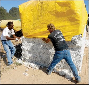 Seasonal workers cover a stack of freshly picked cotton last fall outside of Dumas in Desha County. Photo: Alex Daniels