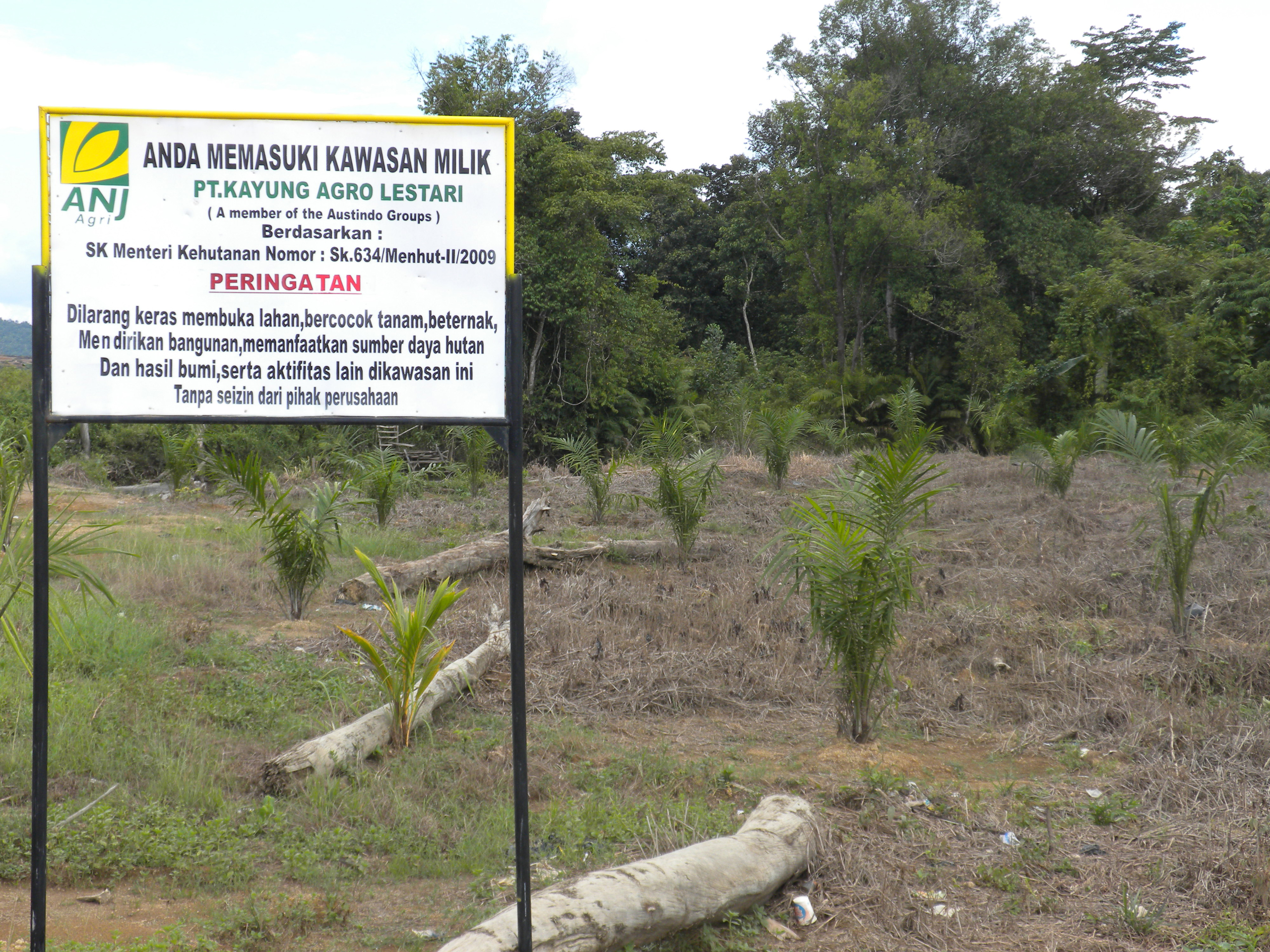 On a PT Kayung Agro Lestari palm oil plantation, a no-trespassing sign stands near newly planted trees.Jack Epstein / San Francisco Chronicle