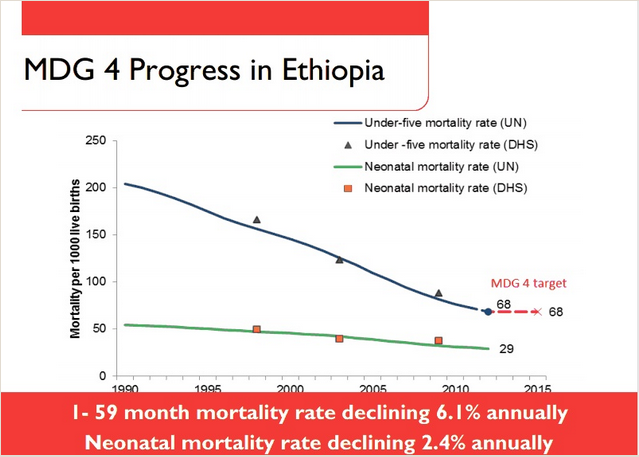The country’s success on MDG 4 illustrates that with dedicated financial and intellectual commitment, Ethiopia’s goal to reduce the number of newborn deaths by 2015 can be achieved. The Health Extension Plan implemented by the government to target the issue is deploying trained Health Extension Workers, and the Health Development Army, both key delivery platforms at the primary level.