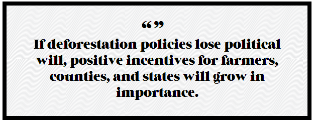 The authors write that the will to curb deforestation "may be weakening in the face of a stagnant national economy ... and if deforestation policies lose political will, positive incentives for farmers, counties, and states that are forgoing or reducing deforestation will grow in importance." None of these incentives, such as low interest loans given to landholders who aren't involved in deforestation, are operating at scale yet.
