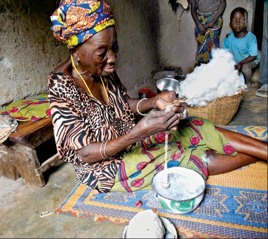 At her home last fall in Pehunco, Benin, Fai Idrissou spins yarn from cottonseed clumps that fell off trucks during the previous year's harvest. Photo: Alex Daniels