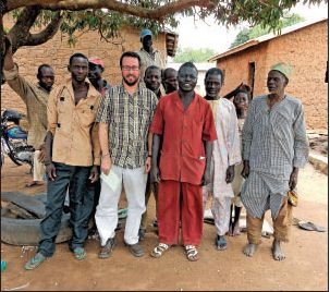 Alex Daniels, a reporter for the Arkansas Democrat-Gazette, stands to the left of cotton farmer Sero Yerima, in the rust-colored suit, and other villagers last fall in Pehunco, Benin. Photo: Alex Daniels