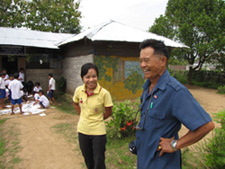 Winston Win laughs with the headmaster of Irrawaddy Flower Garden school. He likes to visit immigrant children throughout the region, singing songs and doing magic tricks. (Julia Lyon / The Salt Lake Tribune)