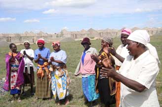 Women from Kaputei and the nearby area sing during a tree-planting ceremony for visitors to the new city. Most of its residents once lived in Nairobi's sprawling slums.