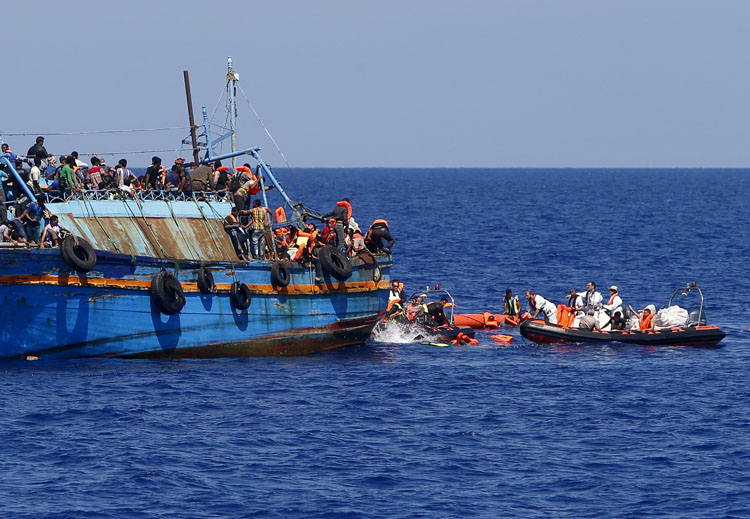 Migrants scramble to get onto Migrant Offshore Aid Station (MOAS) rescue boats launched from the MOAS ship Phoenix after they jumped from an overloaded wooden boat during a rescue operation 10.5 miles off the coast of Libya, August 6, 2015. Photo: Darrin Zammit Lupi/Reuters