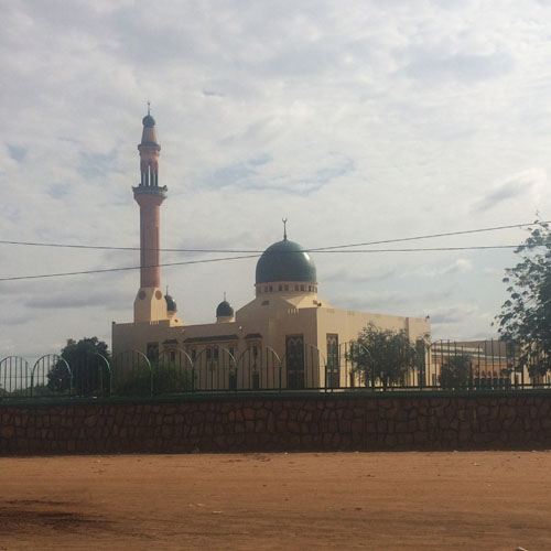 The mosque is a respite in a city where cows sometimes wander into traffic and the skeletons of broken-down cars rot in dusty median strips. Its elegance and openness are almost a deliberate commentary on Niamey’s other landmarks: colorless ministries compound, boxy high-rises, and aging hotels overlooking the Niger River, with their dim lobbies and cloudy swimming pools.
