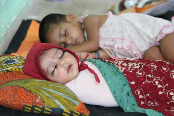 Two sisters, 20 days and 18 months, sleep in a hallway in a slum resettlement project in Mumbai.
