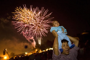 With fireworks going off in the background, Cartoon Wah holds his five-month-old son Eh Ler Wah during the South Salt Lake Fourth of July celebration near Granite High School, Thursday, July 3, 2008. Eh Ler Wah was born in Salt Lake City after his family came to Salt Lake City from Burma. (Chris Detrick / The Salt Lake Tribune)