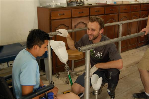 Dave Krupa works with a bilateral patient in the Zacapa clinic in Guatemala. This is a particularly difficult case, as his left leg was amputated above the knee, and his right leg was amputated below the knee. Photo courtesy of ROMP.