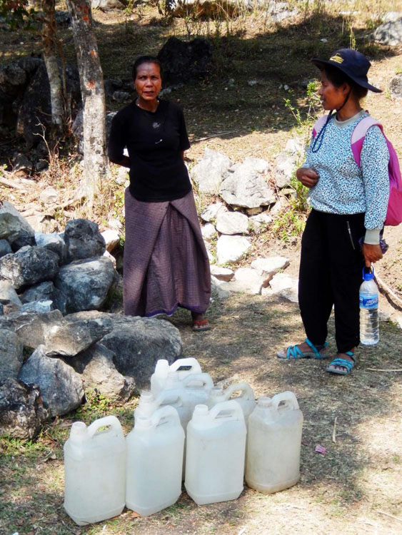 Leopoldina Guterres (right) talks with a local villager at a fresh-water spring on a mountain in Baguia, where women gather every day to fill their jugs. Scientists say climate change could exacerbate dry-season water shortages in the mountains across Timor Leste.